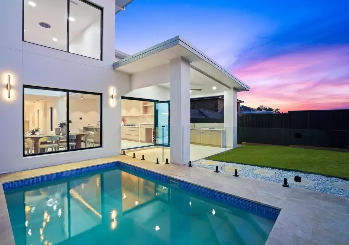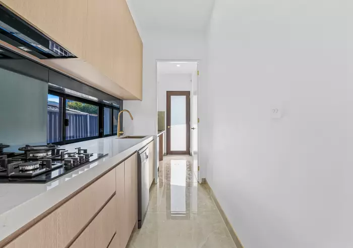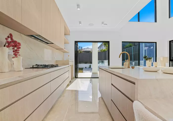 The open family living area boasts a void overlooking the pool, enhanced by a humungous skylight and strip lighting throughout. The gourmet kitchen showcases a Taj Mahal stone benchtop, Bosch appliances, coastal oak joinery, butler’s pantry, and a dedicated bar section.