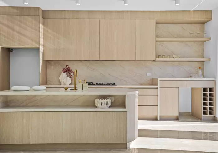 • Gourmet kitchen with: Taj Mahal stone bench top, Bosch appliances, Coastal oak joinery, Butler’s pantry, Dedicated bar section